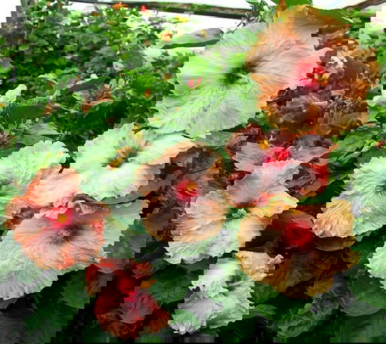 Mango Liqueur produces beautiful 6-8 inches wide, orange and gold ruffly flowers on vigorous bushes. The plant is a cross between Muffin Man and Crème de Cacao and grow to a height of 10-12 feet. The plant is mainly used in party decorations and weddings.-