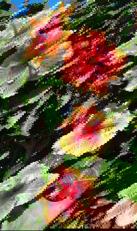 This hybrid hibiscus variety showcases large, 6-8 inches wide flowers, with hoops of golden yellow, white, and candy pink. These blossoms have a bright red eye and orange tints over the edges. It can grow up to 15-20 feet tall.