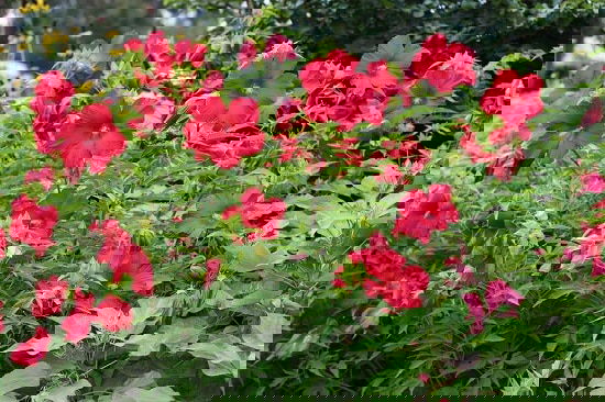 The Aphrodite has large, dark pink flowers with beautiful yellow centers. The deep fuchsia-colored blossoms look beautiful with velvety dark green foliage. This plant flowers in mid to late summer and grow up to 3-5 feet tall, in a sunny or partial shade.