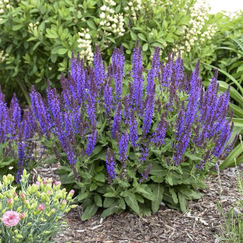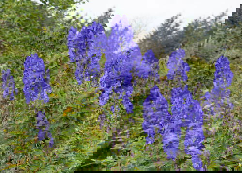 This herbaceous perennial has an upright towering form, it showcases bold spikes of violet hooded blooms with blue undertones topping above the leaves during mid-fall.