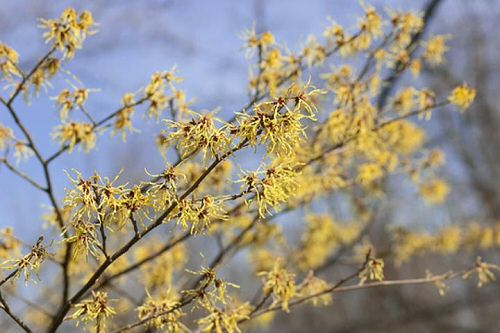 Witch hazel blooms with yellow flowers tinged in red or orange in fall and winter when other bushes and trees drop their foliage. It prefers full sun to partial shade.