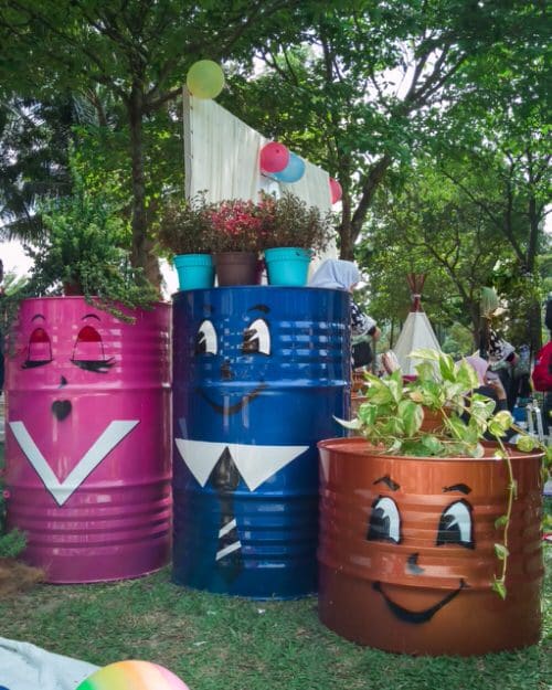 8. Glossy Metal Barrels with Painted Faces as Plant Stands