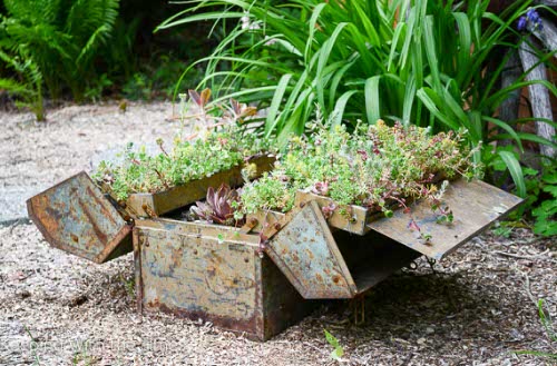 4. Succulents and Other Plants in a Rustic Tool Box