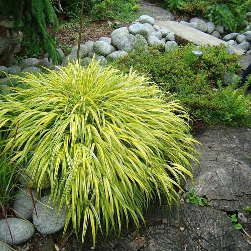 A slow-growing, semi-evergreen shade-lover, Aureola flaunts intriguing variegated golden leaves with green stripes that give this forest grass its unique appearance. The shade plays a vital role in promoting the brilliant chartreuse color that characterizes its look.