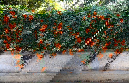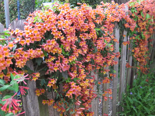 It can grow in a range of conditions like heat, cold, sunny, or shade. The bright orange and red blooms enhance the overall look of the wall.