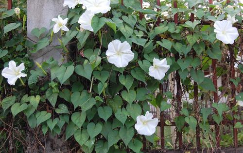 The vine grows 5-6 inches wide white flowers that look like the shape of the moon. It grows up to 15-20 feet and does well in the sun and partial shade.