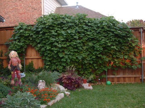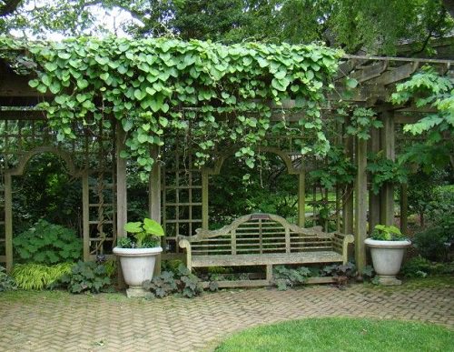 This deciduous flowering vine can grow up to 20 or 30 feet long. The vibrant, heart-shaped large green leaves fill up densely and cover fences where you need privacy and exotic flowers.