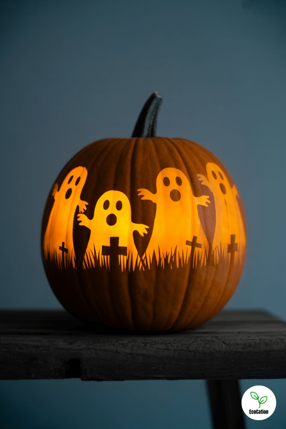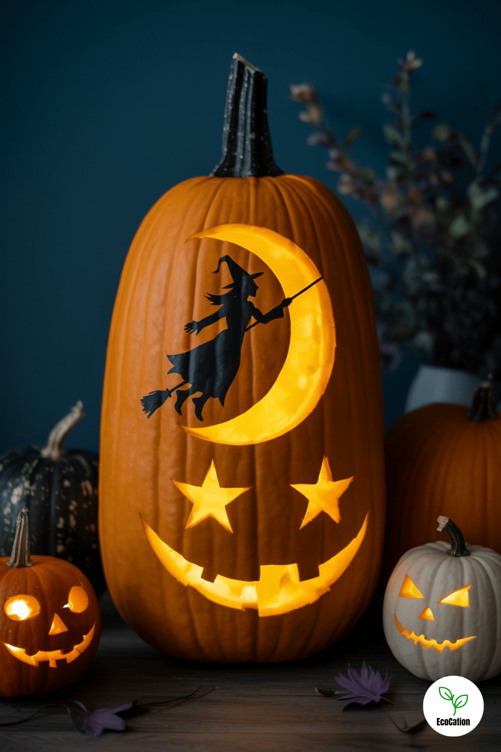 A witch silhouette flying across a crescent moon gives your pumpkin a mystical, storybook feel. Use a stencil for crisp edges, and a tall pumpkin to give the design vertical space. It looks best lit with a soft yellow glow.