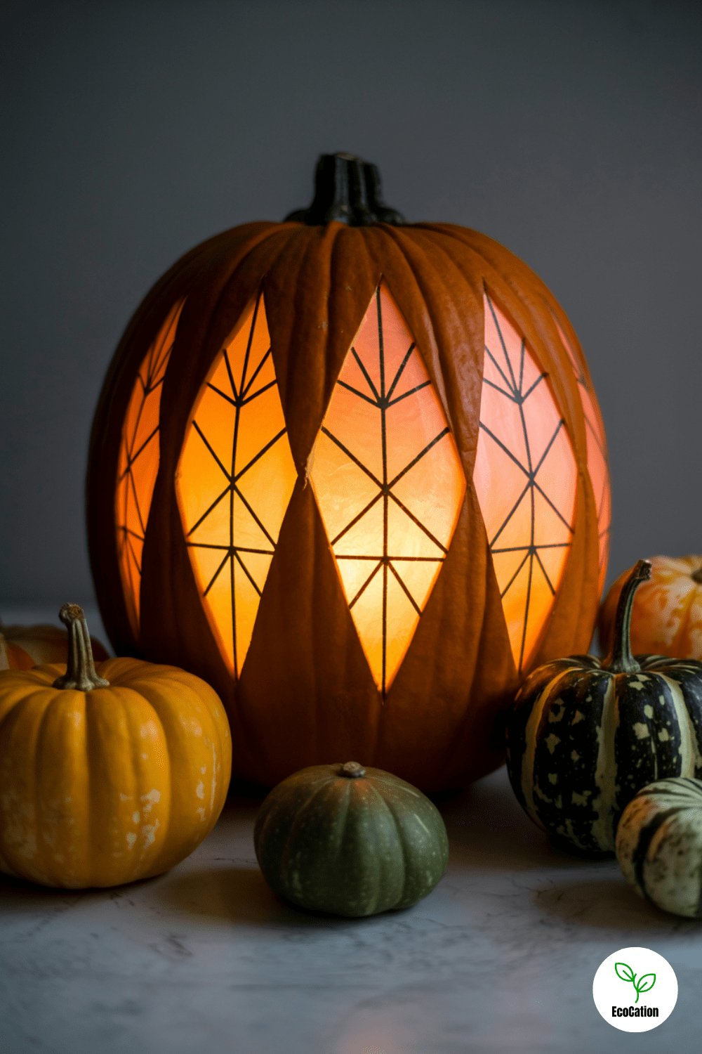 Cut geometric patterns into your pumpkin and line the openings with colored vellum or tissue paper. When lit from within, it glows like stained glass. It s an elegant, artsy twist that brings a little sophistication to your display.