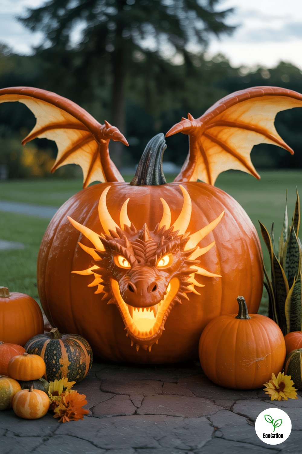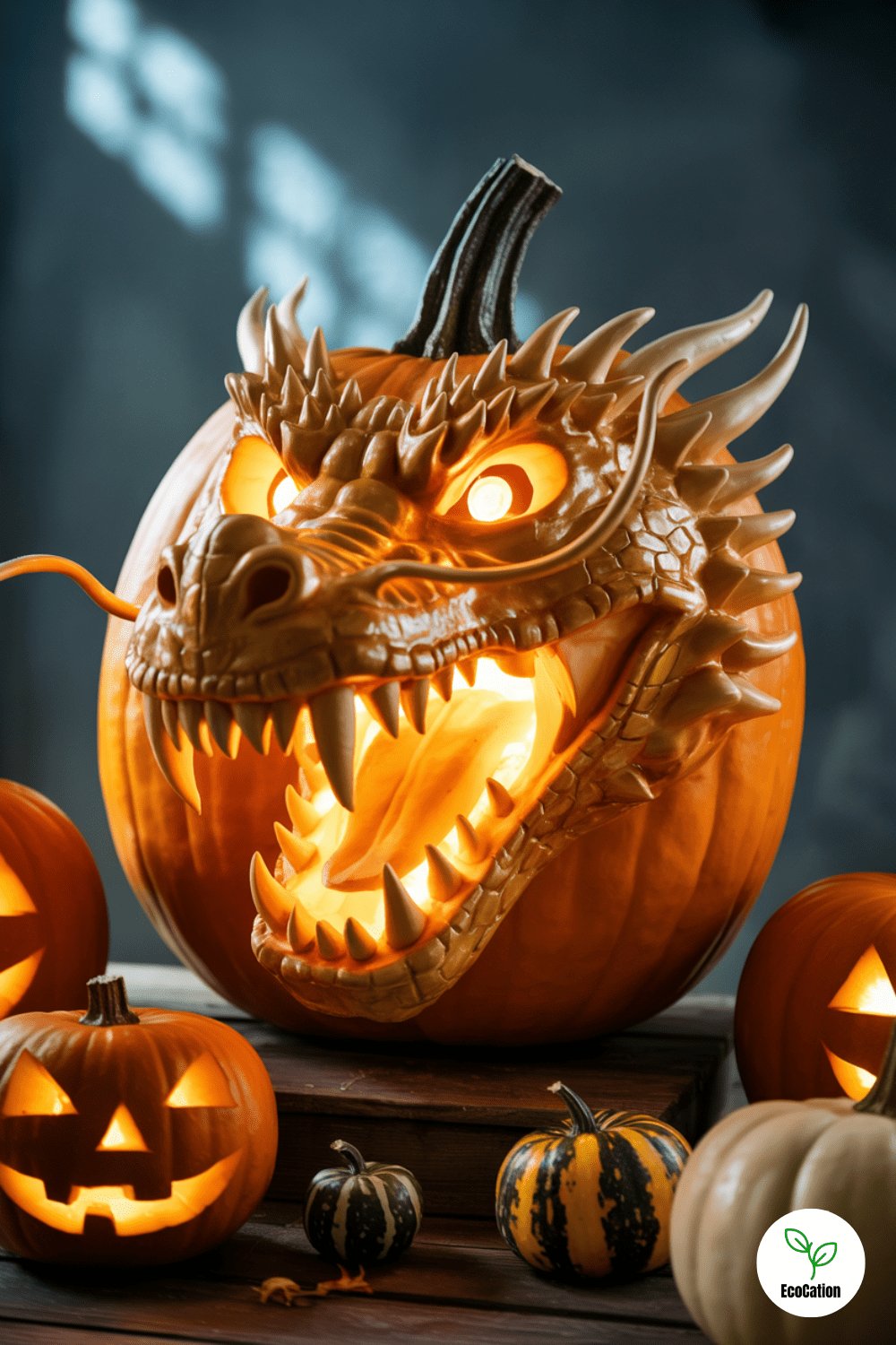 Go big with a roaring dragon head carved into a large pumpkin. Carve deep grooves for the fire and fine textures for scales. Place a red or orange light inside to simulate fire glowing from the mouth.