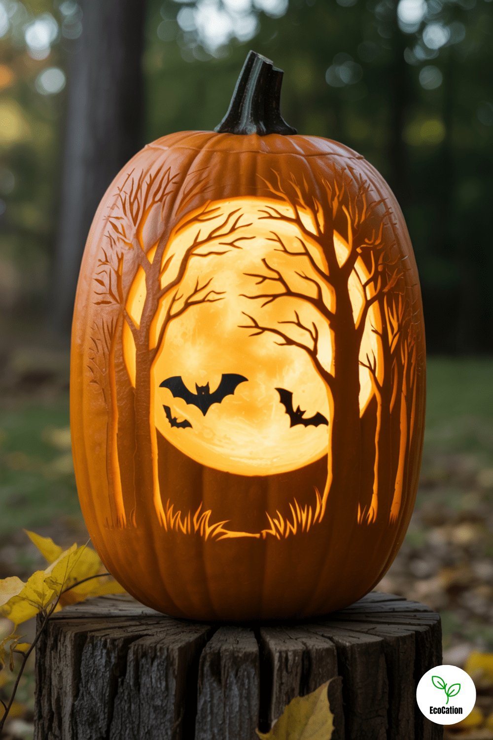 Create a miniature forest scene with tall trees, bats, and a rising moon. Use a tall pumpkin for more vertical space and layer your cuts to suggest depth. It s an atmospheric, nature-inspired design that sets a cozy tone.