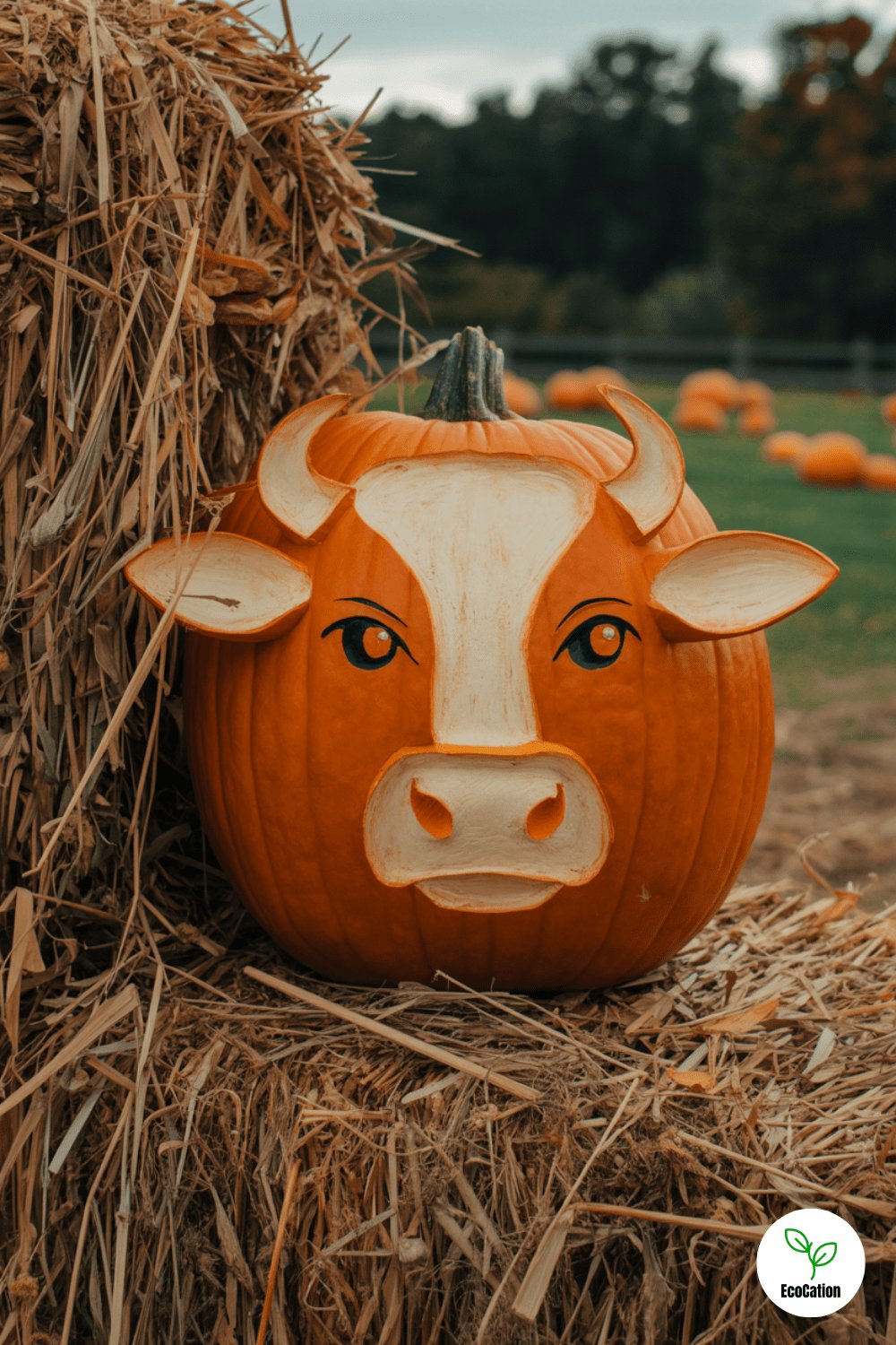 Carve a cartoon cow face with gentle curves for ears, nostrils, and spots. Add a little paint for extra detail, and nestle it among hay bales. This rustic, farm-inspired carving is great for autumn festivals or cozy porch displays.