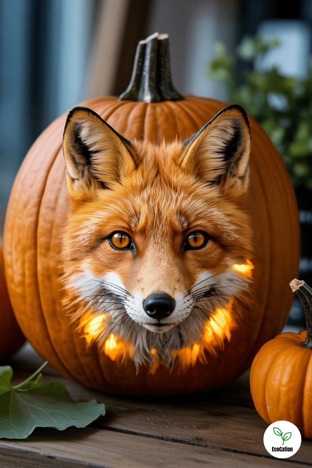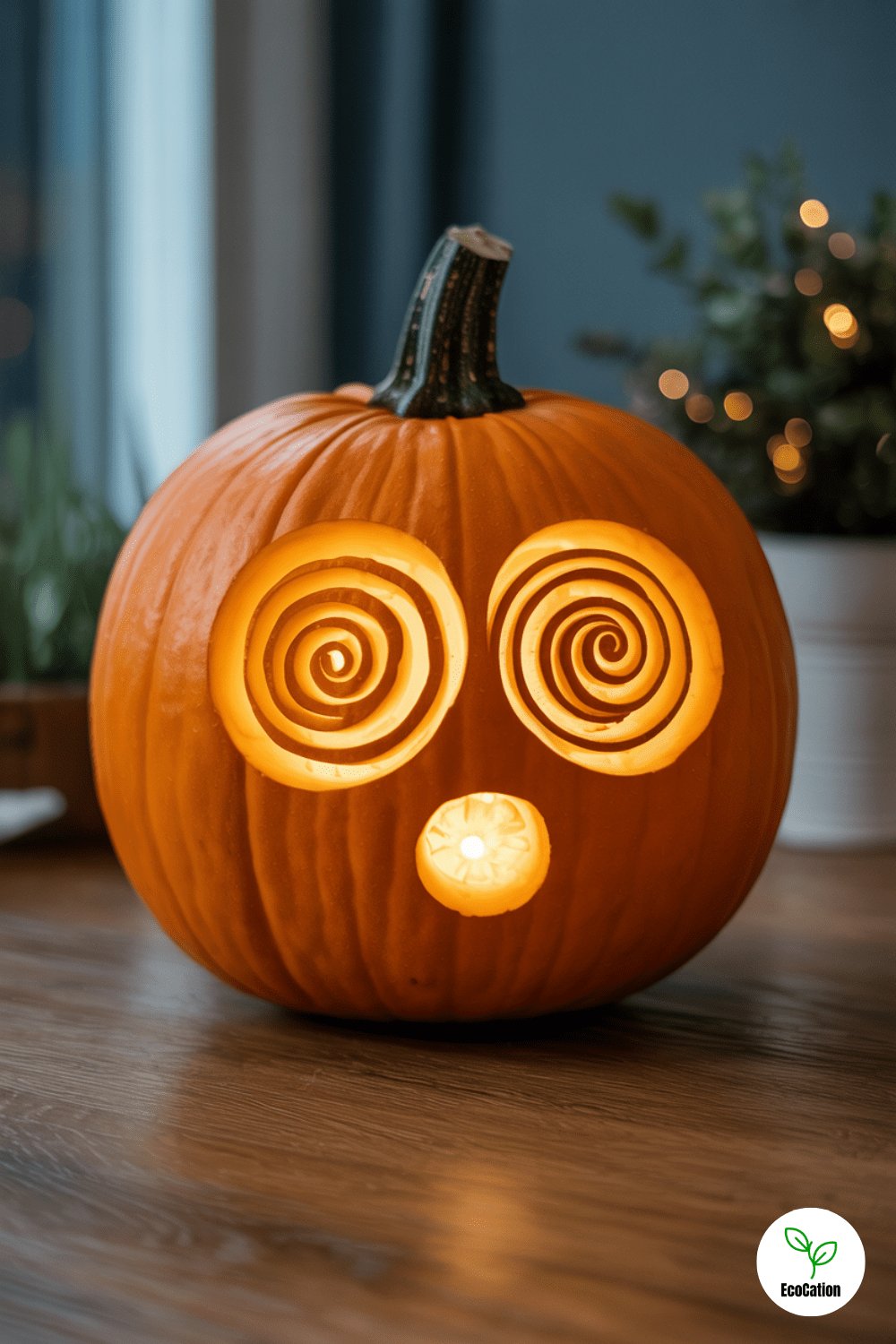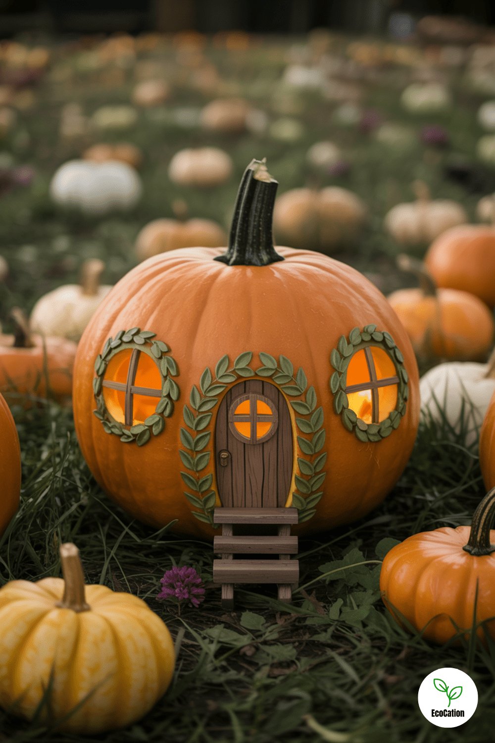 Turn your pumpkin into a tiny enchanted home with round windows, a leaf-framed door, and soft lighting. It looks adorable in any pumpkin patch setting. Use a carving knife to etch fine lines into the roof and decorate with moss or acorns for extra charm.
