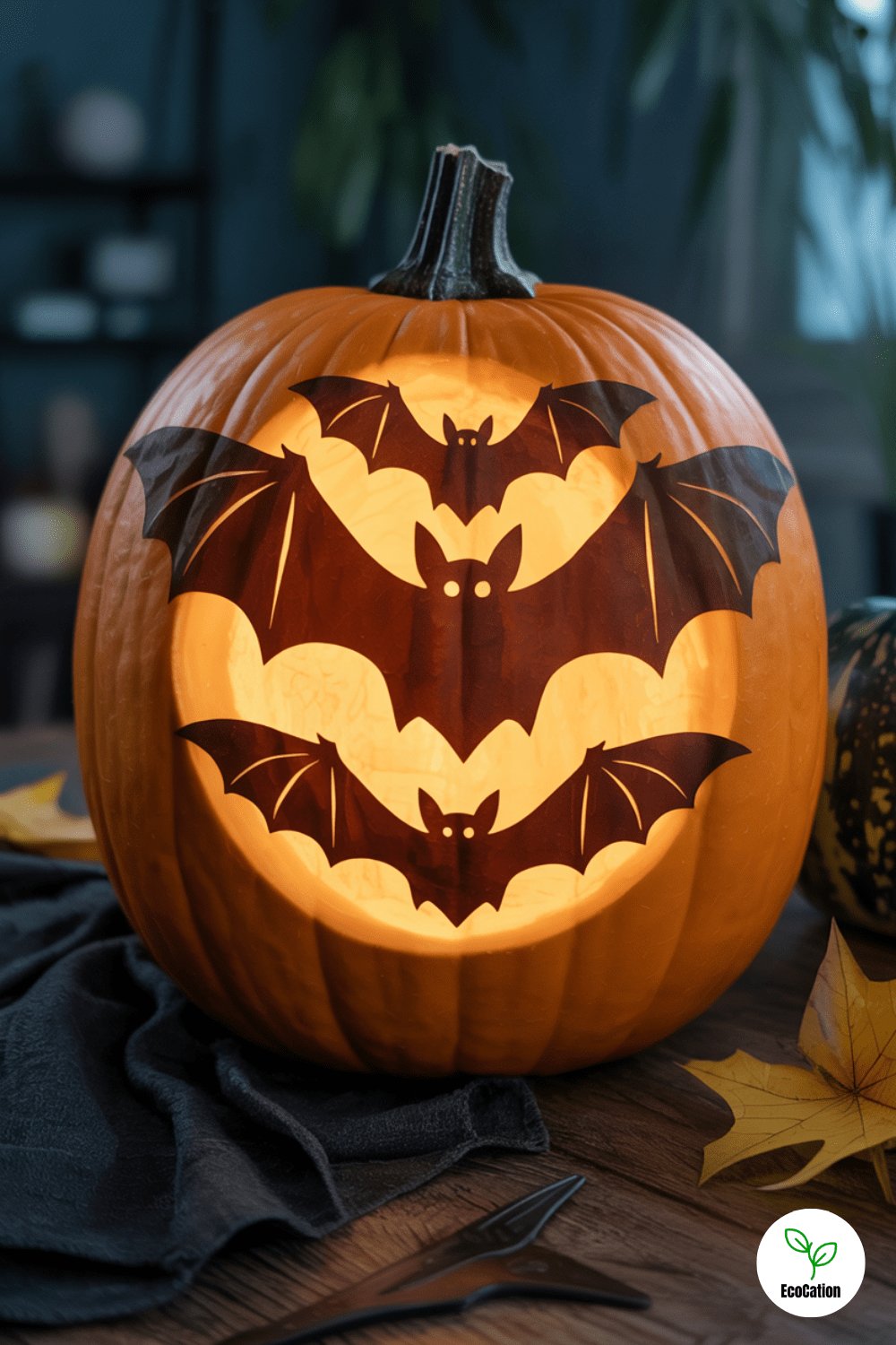 Make your pumpkin come alive with flying bats in mid-motion. Start with a central bat and add smaller ones fanning outward. Keep the cuts clean for high contrast, and consider painting the inside black for extra effect.