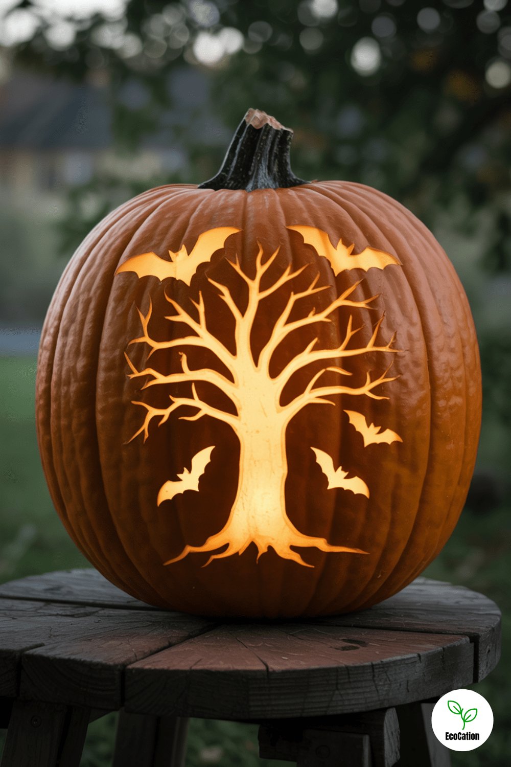 Gnarled trees and swirling bats make this one of the most atmospheric spooky designs. Carve the tree first, then add bats in different poses flying across the top. Add depth by leaving some bark-like texture around the trunk.