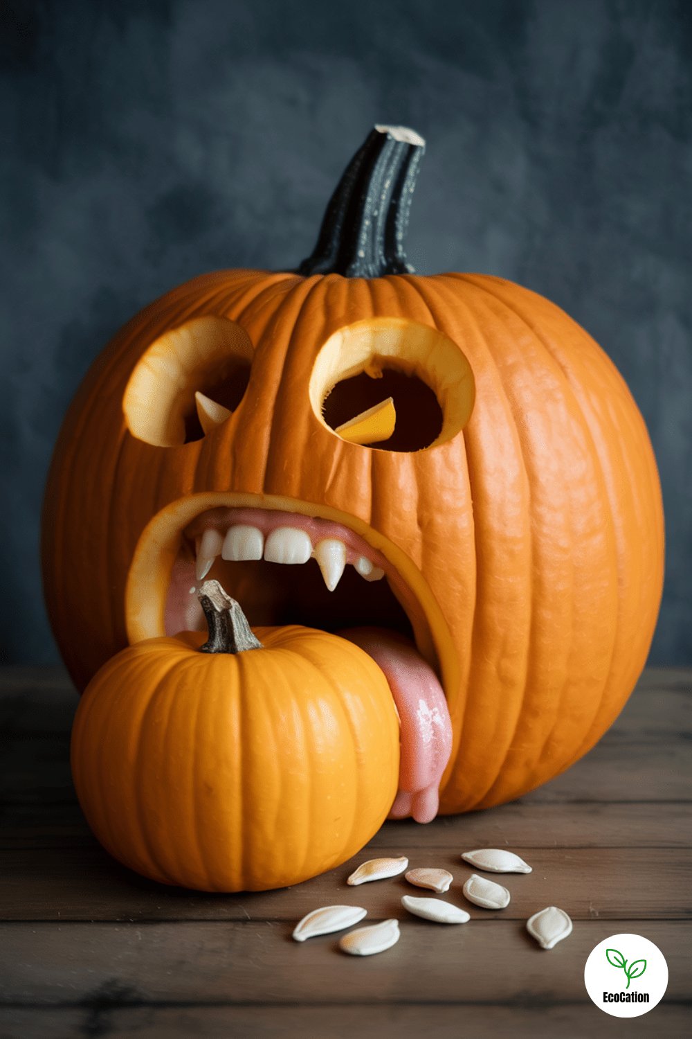 Carve a large pumpkin s mouth wide open, then stick a smaller pumpkin inside like it s being eaten. Add fake seeds and stringy pulp to simulate drool. It s weird, wild, and guaranteed to get a reaction.