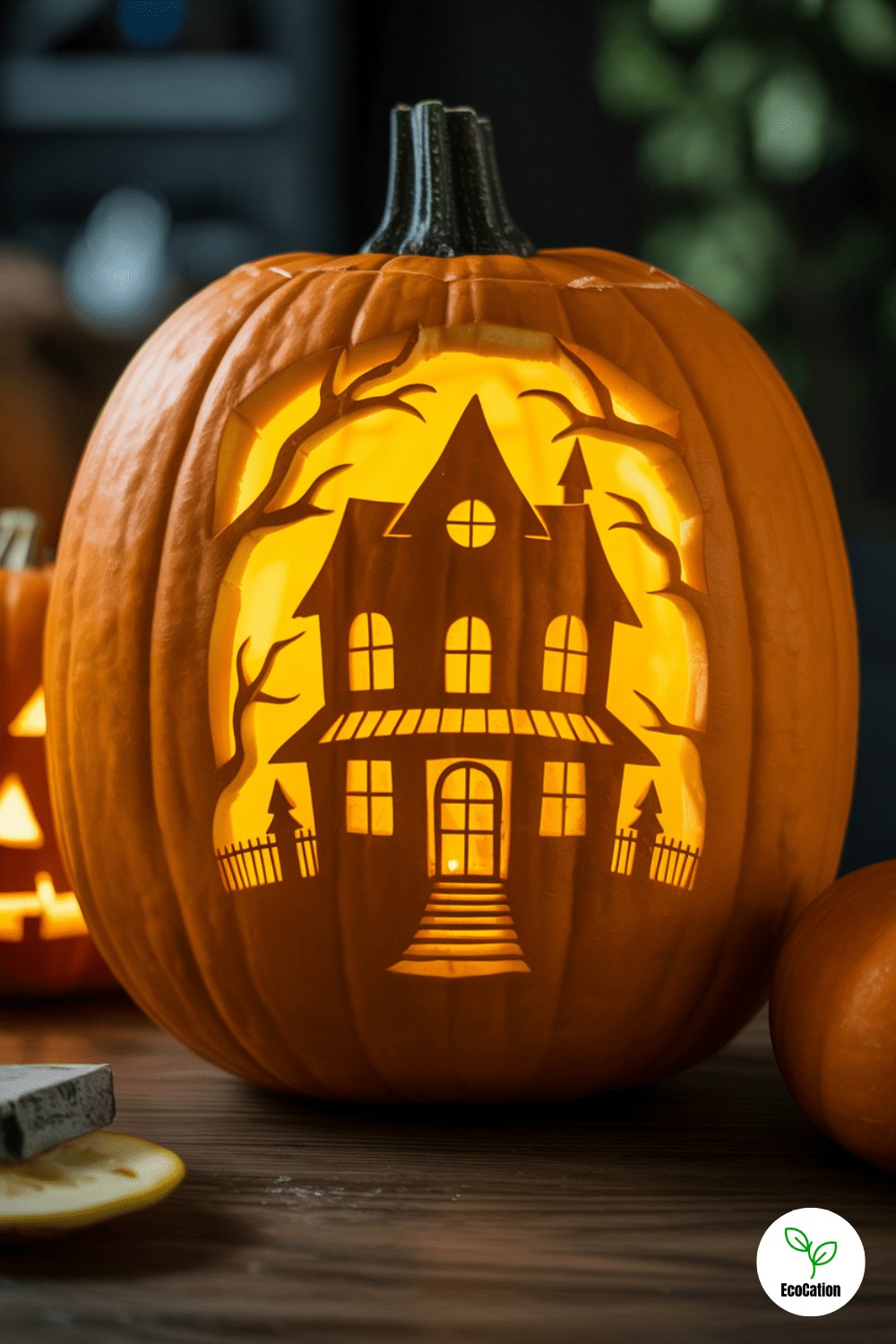 Bring a ghostly story to life with a haunted house carved into your pumpkin. Think crooked windows, eerie trees, and glowing doorways. Use a stencil for precision, and carve at varying depths to create a shadowy, 3D effect. Add a flickering LED light for that haunted vibe.