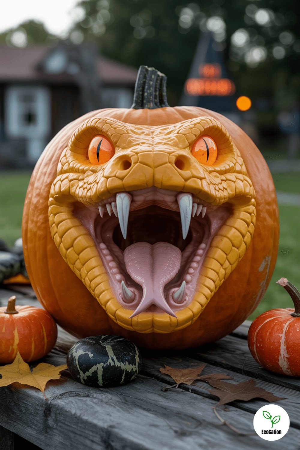 Add a creepy twist with snake-like fangs and glowing reptilian eyes. This design makes your pumpkin look like it s about to strike, especially when backlit with a red LED. Carve the teeth at sharp angles for a realistic bite and use textured lines to mimic scales.