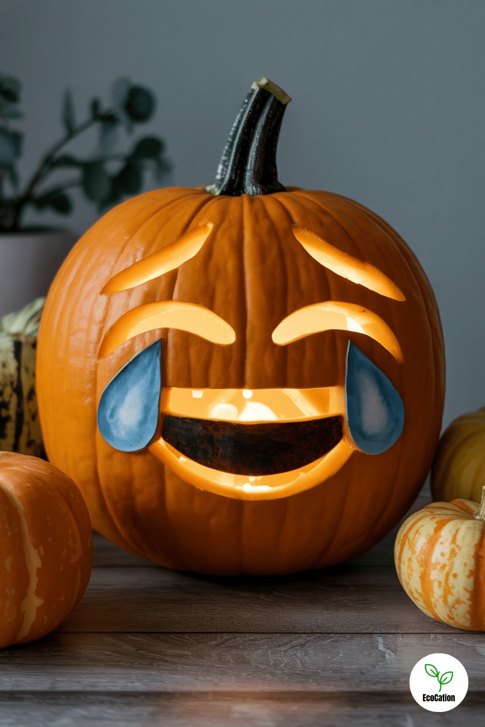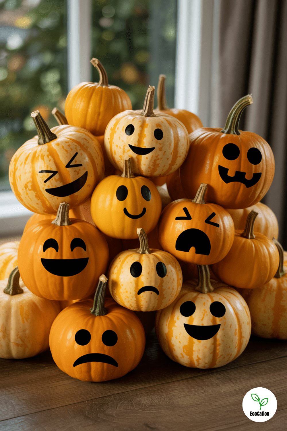 Grab a bunch of mini pumpkins and give each one a different emoji face laughing, shocked, angry, scared. Use small carving tools or even a linoleum cutter for details. Arrange them as a group for a quirky and expressive centerpiece.