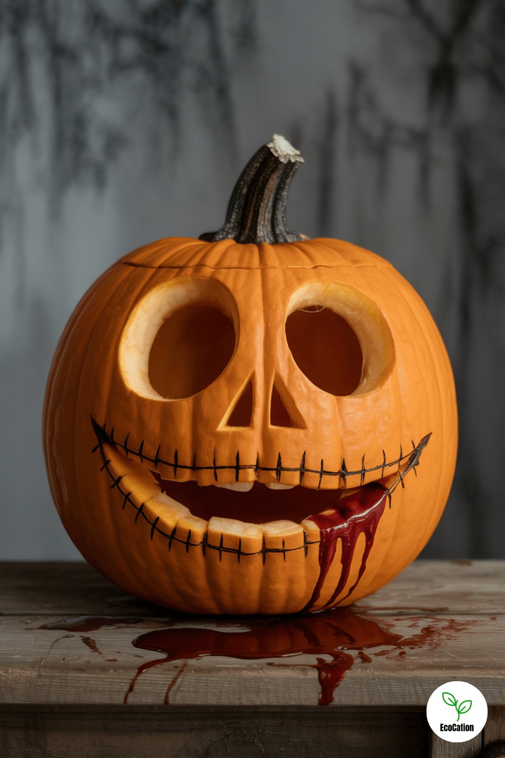 Carve wide, hollow eyes and a stitched mouth, then drizzle on some fake blood for a creepy effect. This one is all about eerie vibes and works best in low light. Keep the lines jagged and uneven to amplify the horror feel.