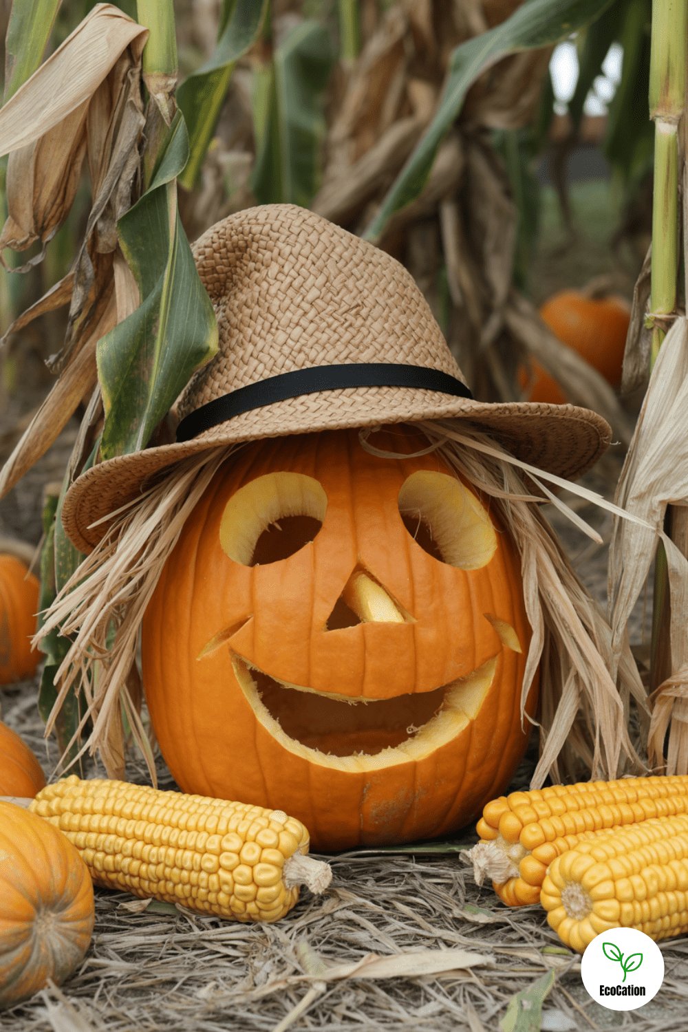A cheerful scarecrow face with stitched features, straw details, and a carved smile brings the fall spirit to life. Top it with a real straw hat or corn husks for extra effect. Ideal for rustic front porches and farm-themed decor.
