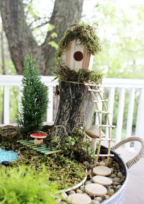 A tall planter can be used to make a fairy garden using miniature accessories.