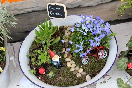Succulents and gnome accessories are great to make a small fairy garden in a shallow bowl.