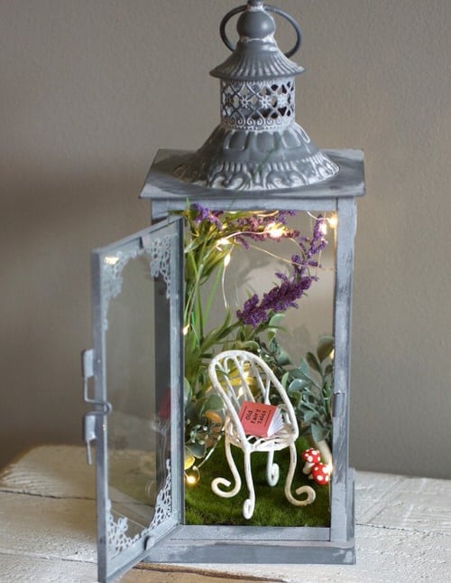 A fairy garden in a lantern is a great way to utilize an old one. You can also use LED lights!