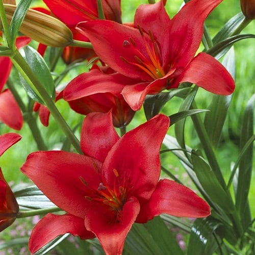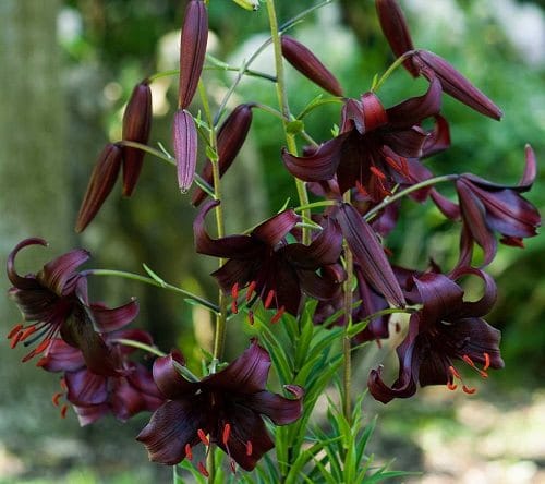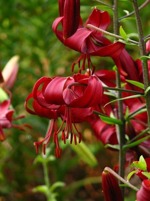 This classic lily is known for its inverted bowl-shaped, eye-catching, dark red flowers with backward-curling petals. It can reach up to 4-5 feet tall and produce more flowers year by year.