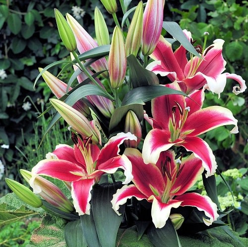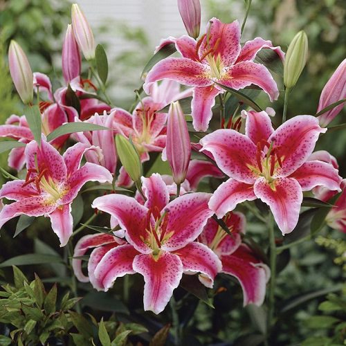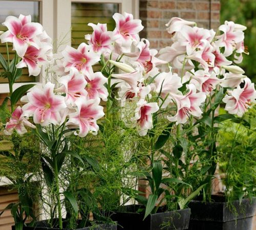 This is the cross between oriental and trumpet lilies. The plants display large fragrant flowers in a combination of pink and white, with a green center. It can grow up to 4-5 feet high and is perfect for hedges or borders.