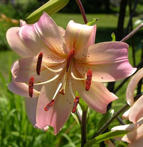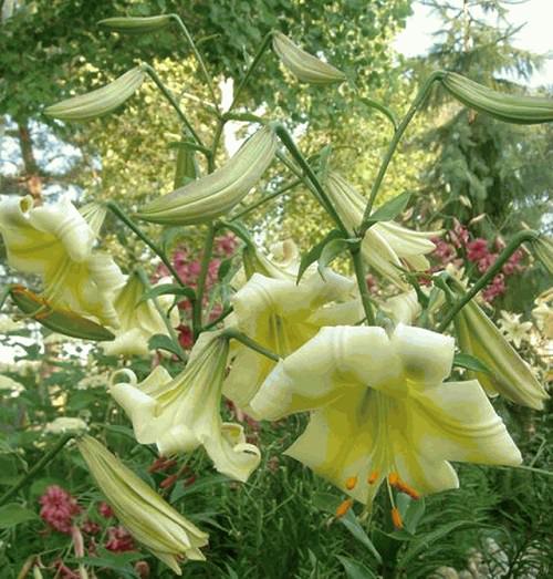 Longiflorum Hybrids flower in the middle of summer. These lilies are hybridized from Easter lily or l.longiflorum species and can be planted from seeds. The flowers are bowl-shaped, fragrant, and curved back atop 3-4 feet tall stem.