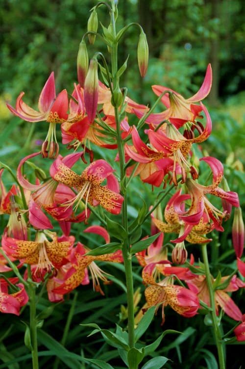 This lily abundantly produces 40-50, pendulum-like, red-pink flowers with down-facing golden stamens on each stem. The red-speckled flower opens in early June and combines well with other tall shrubs in the garden.