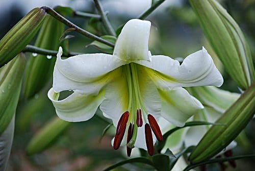 White Elegance is considered as one of the hardiest Longiflorum lilies. The flowers are heat and humidity tolerant. Its leaves and petals are thick enough that withstand scorching. The large yellow-green buds open in pure white flowers that lean obliquely.