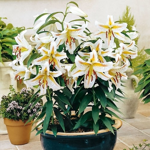 This pretty lily forms classic white trumpets with flaring petals. The golden spots from the center on both sides make the flower more beautiful. The plant can grow up to 6-7 feet high.