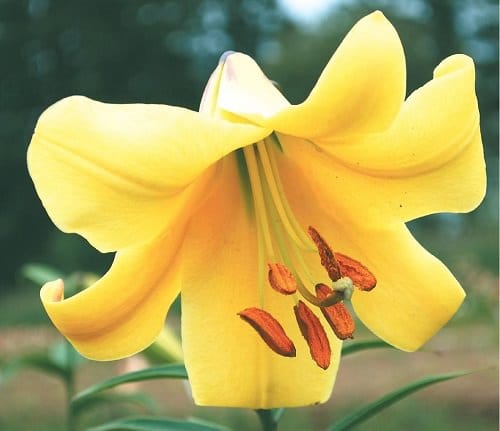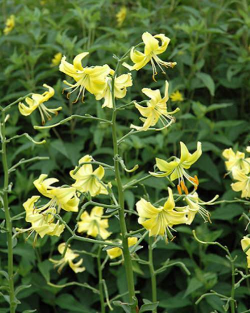 This attractive lily forms light flowers that bow with the wind. The downward-facing blossoms are lemony-yellow and have curved petals. It attains a height of 4-5 feet.