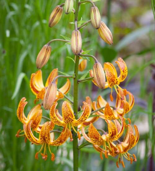 Native to Eastern parts of North America, this lily flaunts downward-facing mottled flowers in yellow and red shade. It can grow up to 4-5 feet tall in dappled light, from June to July.