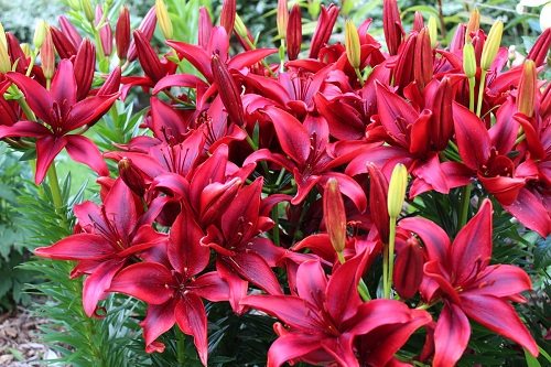 This eye-catching lily features upward-facing, dark red flowers with red stamens. The glossy petals have deep burgundy shades near the center with raised spots. This 2-3 feet tall plant produces a cluster of 4-5 flowers.