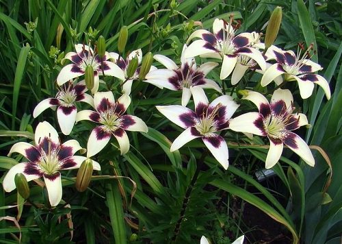 Big-Bang features six-petaled, out-facing flowers in a creamy white hue, filled with burgundy spots and swirls. The stamens are crowned with dark bronze anthers. It can reach up to 3-4 feet tall.