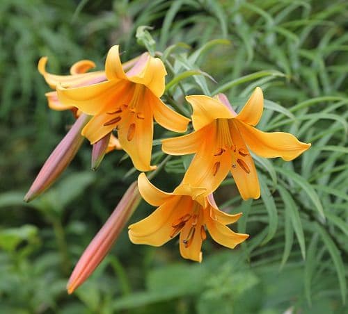 This lily variety showcases pretty light pink buds with red tips that open into golden yellow flowers with curved petals that are heavily mottled. The center matches the rough orange anthers. It can reach up to 4-6 feet high.