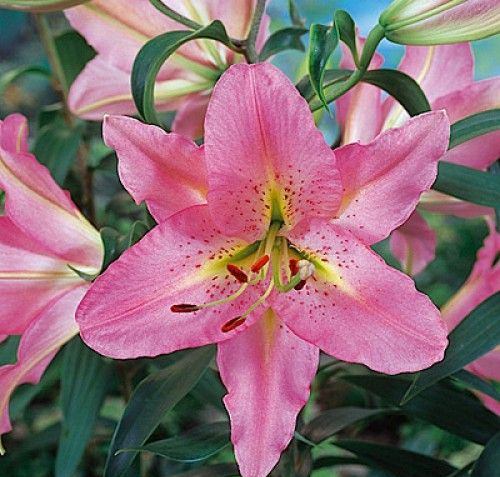 This variety is a cross between Asiatic x Oriental x Asiatic (AOA). It displays thick, soft pink flowers, with deep shaded center and spots. The flower becomes lighter in color with maturity.