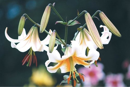 Trumpet and Aurelian Hybrids were originated from Asian species like L.henryi and L.regale. They form large, waxy fragrant trumpet-shaped flowers, in a range of colors on 4-8 feet tall stems from mid to late summer. The flowers face in an upward direction or bend downward, whereas flowers of other varieties are flat, reflexed, or bowl-shaped.