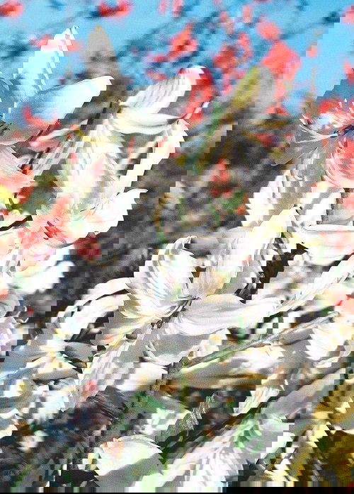 This Asiatic lily is admired for its tall cluster of white flowers, with pink bottom sides. When the flower fully opens, curling petals uncover the contrasting stamens.