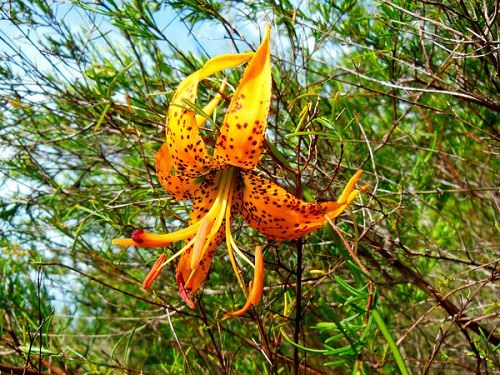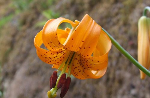The Columbian lilies can be seen in the open woods of western North America, The orange flowers are lightly fragrant and have dark spots on outward curled petals on 4-5 feet tall plant.