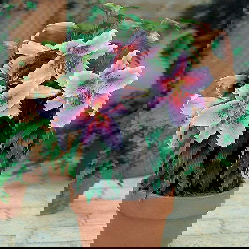 The flower looks appealing with its ruffled, upward-facing, soft pink flowers with white edges, red midribs, and matching spots. The plant can grow up to 2-3 feet tall, which makes it perfect for containers or ground.