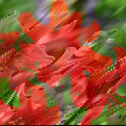 This hybrid variety has lightly scented, deep red-orange flowers with purple spots. The leaves curl outward, showing off the orange stamens. It can grow up to 5-6 feet tall.