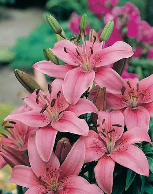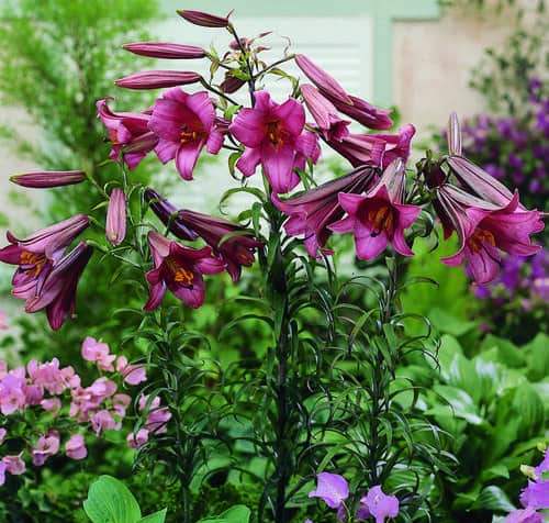 This lily variety bears a cluster of yellow buds that open into upward-facing magenta flowers in summer. The upright towering plant can reach up to 3-4 feet tall.