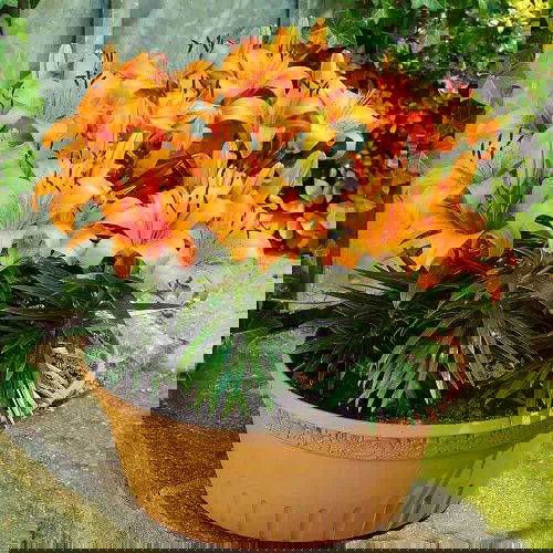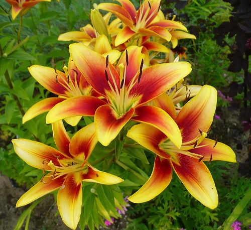 It is a cross between Oriental and Asiatic lilies. The flowers have warm tones in red, yellow, orange hues, blending from the dark center to lightly-shaded tips.