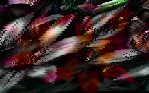 The airy flowers look amazing with deep maroon flowers having orange edges and leopard skin-like markings. The fully exposed, golden pollen-covered anthers complement the beauty of each flower.