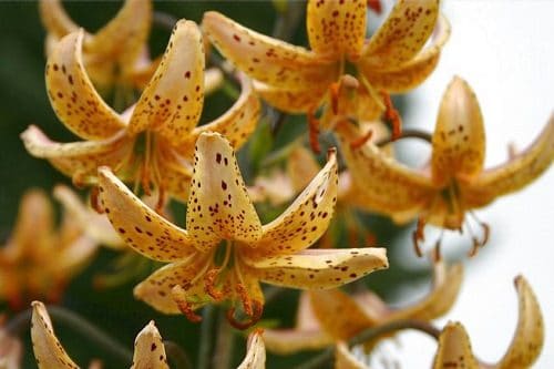 Carolina Lily shows off nodding speckled yellow-red flowers with curved petals, The yellow-green stamens, with dark brown anthers, charmingly complement the entire look of the flower.
