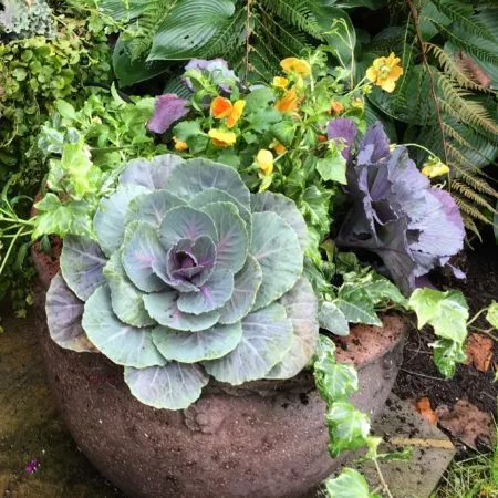 Many fall container plants carry right into the first frosts. Ornamental kale and pansies, for instance, actually look their best as temperatures drop.
